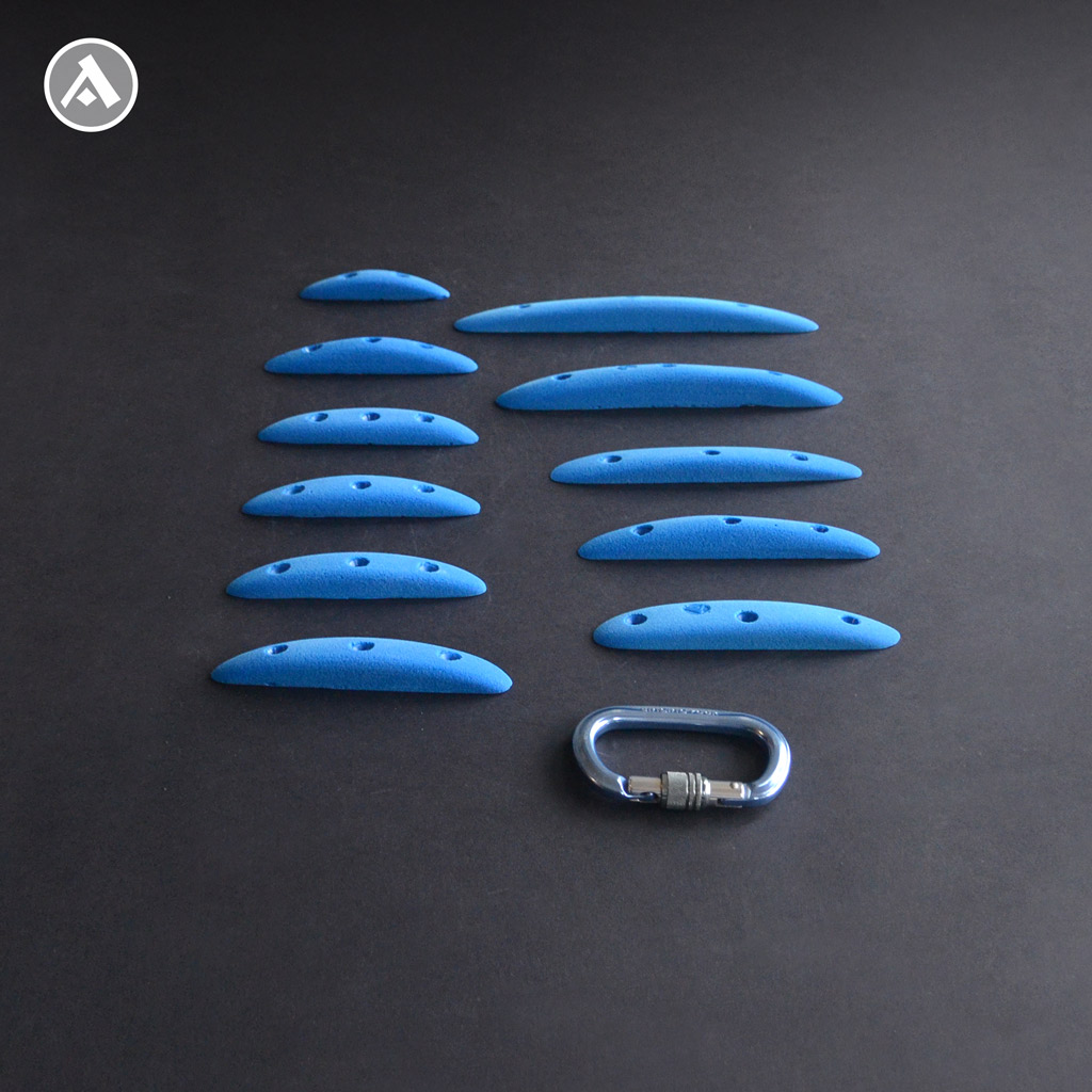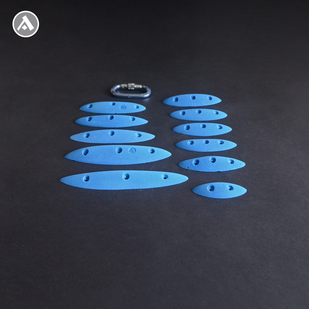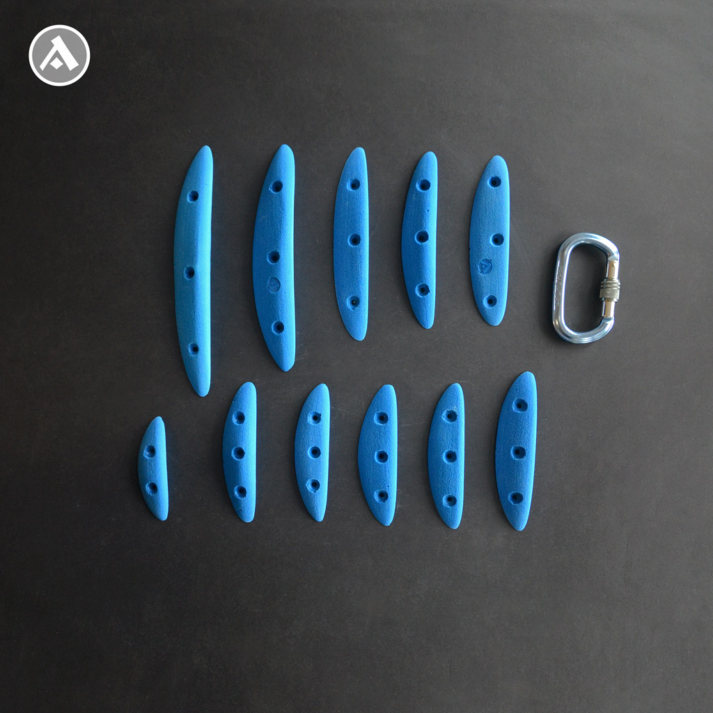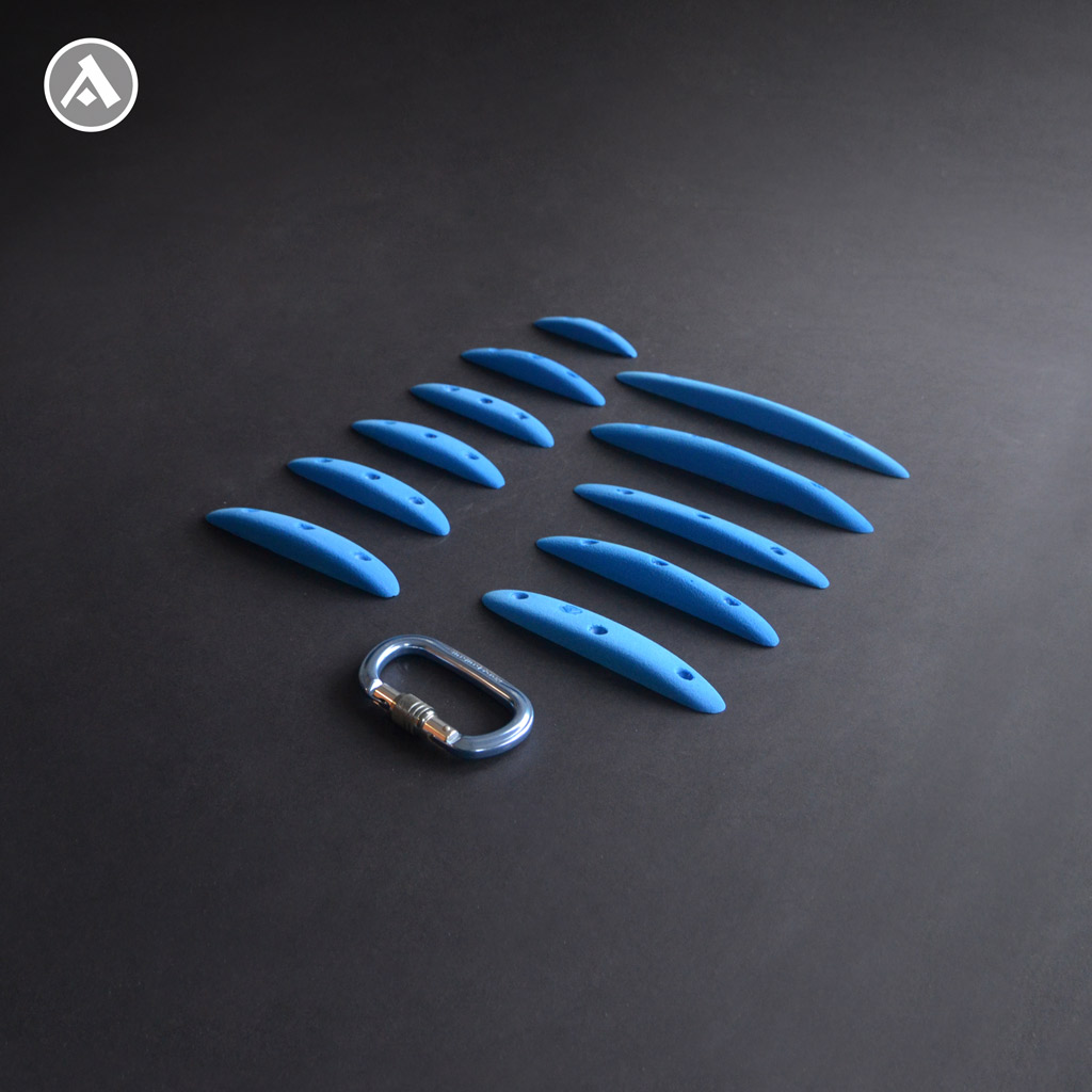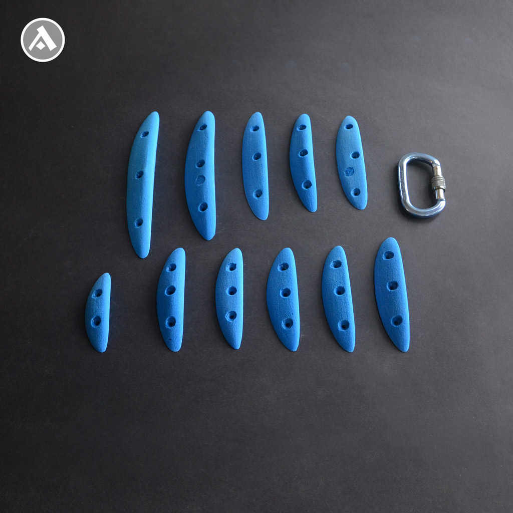 Set of 11 narrow climbing holds with 2-3 finger edges. These holds are narrower, but comfortable to hold. Even intermediate and experienced climbers will find their way. The set includes different lengths of edges and is ideal for building a technically interesting boulder. They are mounted on the climbing wall using wood screws.