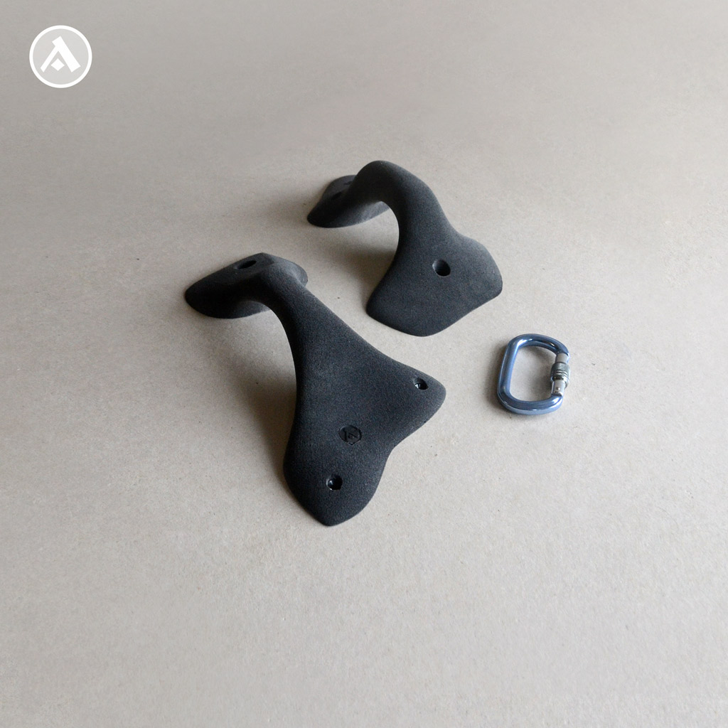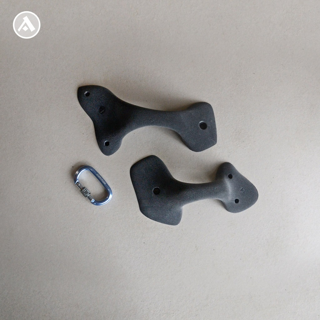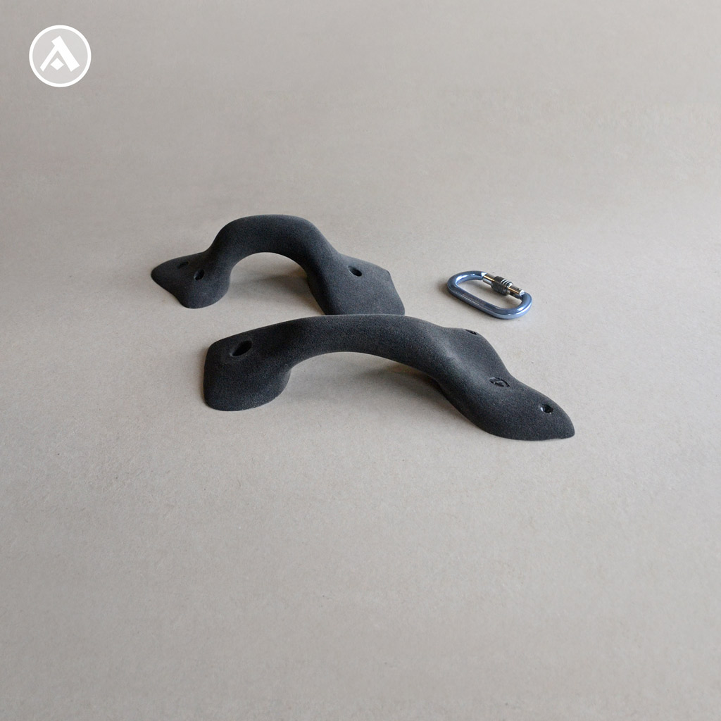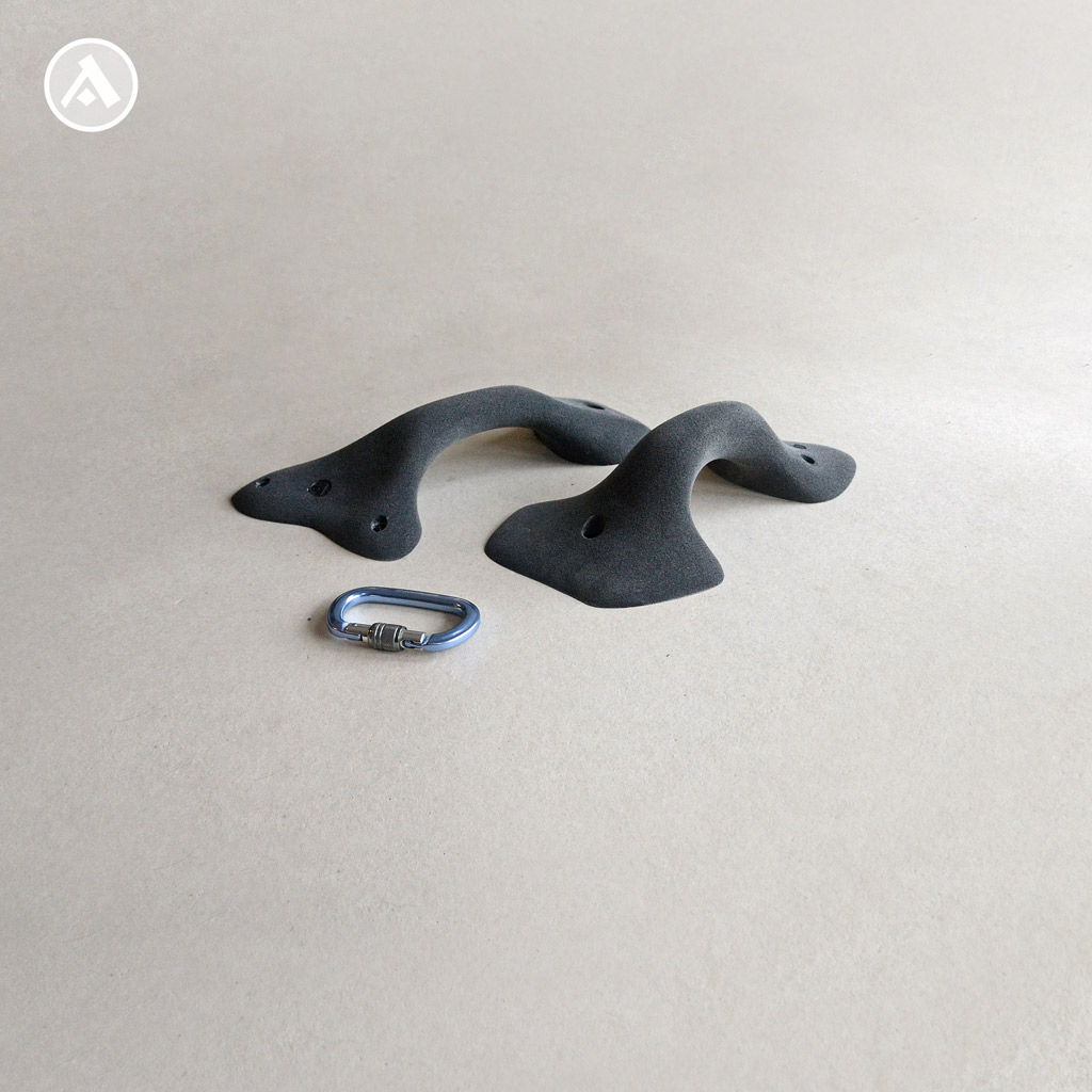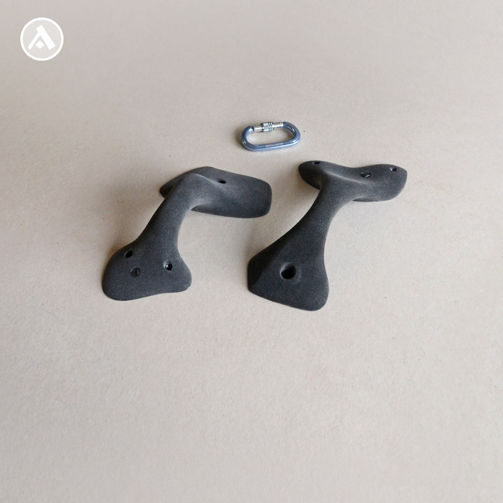 A pair of climbing holds that are very easy to grip. They will serve on the ceiling and the most difficult climbing profiles for easy climbing or resting. You can mount them on the climbing wall using Allen screws and wood screws.